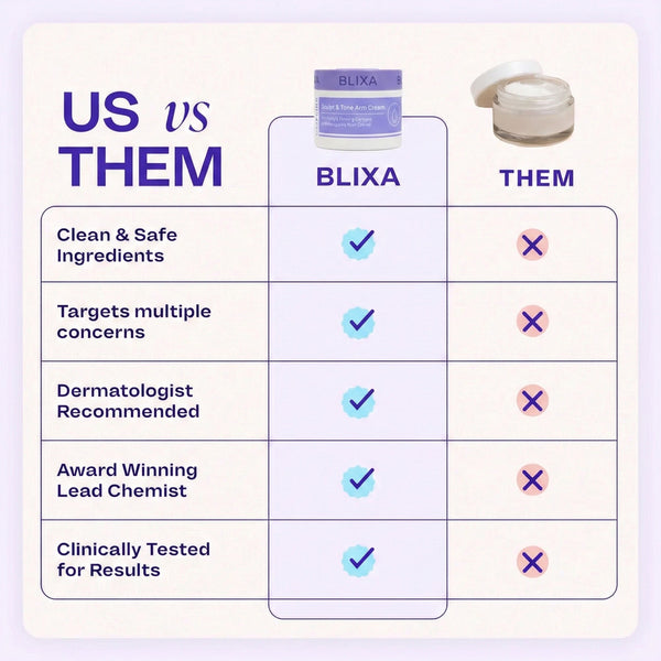 Unlike typical body lotions, Blixa targets the actual look of loose and crepey skin. It works on all skin types, soothes and hydrates while firming, and delivers clinically tested results without procedures or downtime.